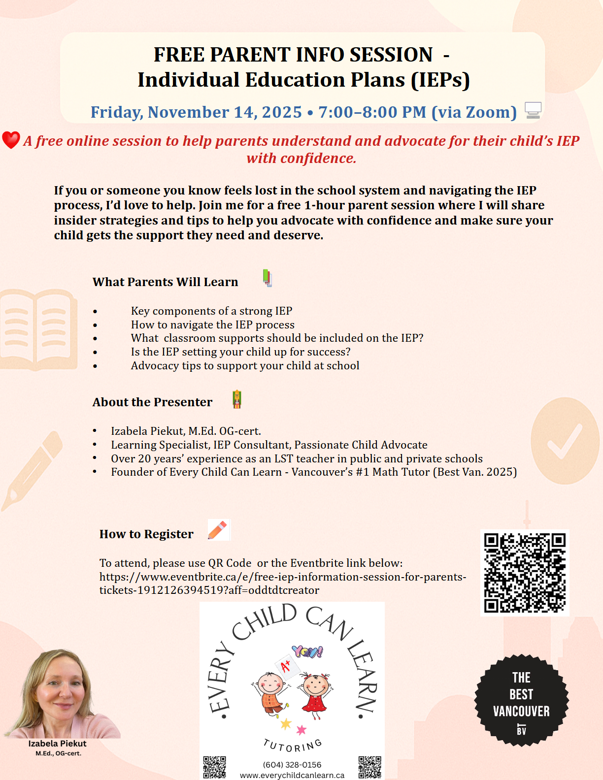 During my extensive work as a Learning Support teacher, LAC Coordinator, ESL specialist and Therapeutic Orton-Gillingham practitioner I have gained highly specialized knowledge in designing success-oriented, high quality, targeted individualized education plans (IEPs) for students with learning differences.